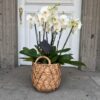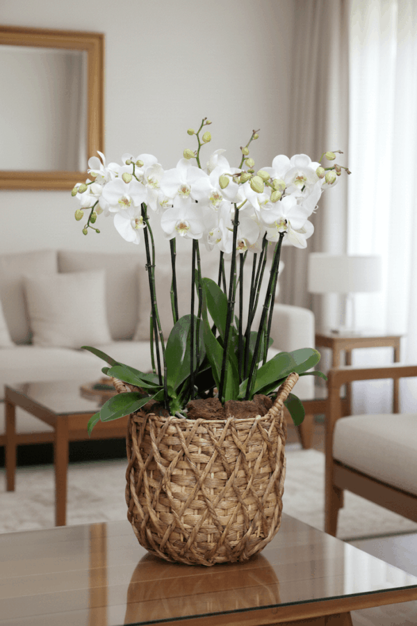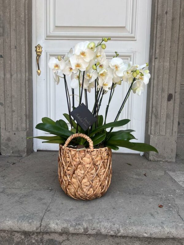 Experimenta la tranquilidad y la sofisticación que emana este hermoso arreglo de orquídeas blancas. La delicadeza de sus pétalos inmaculados y la pureza de su color evocan una sensación de paz y armonía. Cuidadosamente dispuestas en una canasta tejida de mimbre, estas orquídeas se convierten en un punto focal elegante y atemporal. Ya sea para adornar tu espacio personal, crear un ambiente acogedor en tu lugar de trabajo o para expresar tus sentimientos más sinceros a través de un regalo refinado, este arreglo de orquídeas blancas es una elección que perdura y deleita.