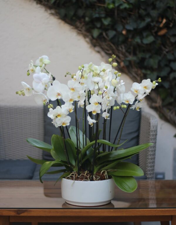 Esta magnífica orquídea viene plantada en una moderna y estilizada maceta de cerámica en un suave tono celeste o blanco. El color de la maceta complementa a la perfección la blancura de las flores o color, aportando un toque de frescura y tranquilidad al conjunto. Su diseño minimalista y contemporáneo se integra armoniosamente en cualquier estilo de decoración, desde el más clásico hasta el más vanguardista.. Orquídeas México.