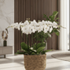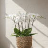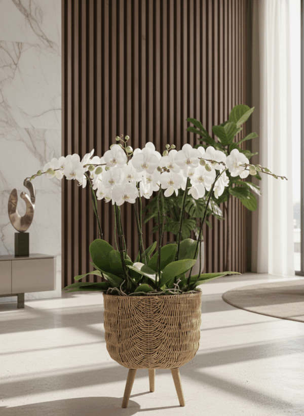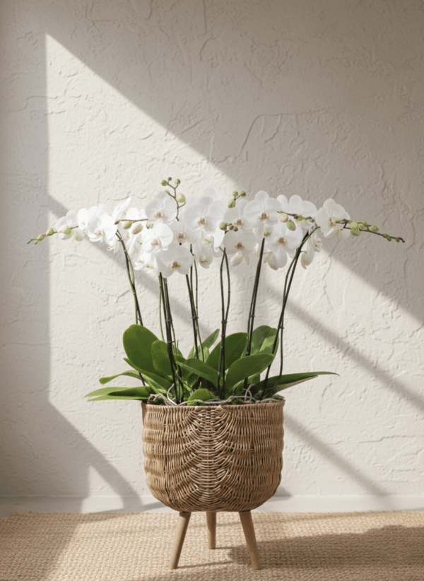 Blanco, relajado y alegre, así es este bello conjunto de orquídeas en base de ratán con patitas, contiene 7 plantas de orquídea Phalaenopsis = 14 varas de flores a más, un diseño llamativo, sorprende realmente a alguien con este diseño.