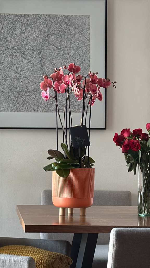 El amor y cariño por esa persona es grandísimo, así como este inusual arreglo de orquídeas, nuestro más emblemático arreglo, único y original. Un detalle que sorprende por su tamaño. Un modelo especial de maceta de cerámica + patas de madera, con orquídeas de colores. Arreglos florales elegantes.