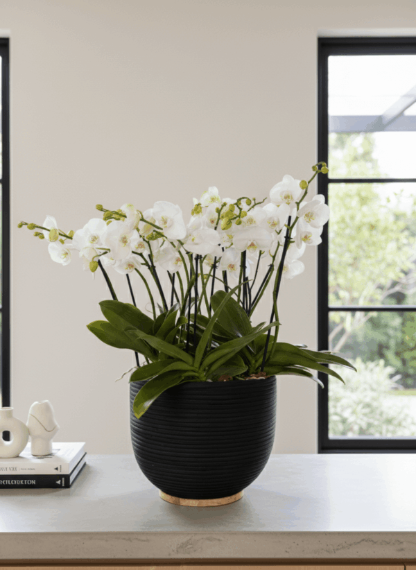 Una bella base de cerámica fina con 7 plantas de orquídea Phalaenopsis igual a 14 varas florales. Te encantará. glos florales hermos