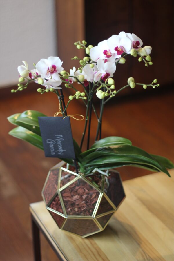Terrario de mini orquídea, una pieza de diseño único con un toque de sofisticación. El cristal facetado y los detalles en dorado realzan la belleza natural de la orquídea, creando un adorno moderno y lleno de vida para cualquier espacio.