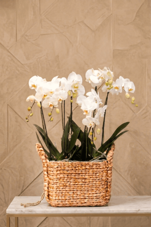Un diseño de orquídeas coloridas o en el color que prefieras en una bella base tejida de mimbre. Envío de orquídeas en CDMX y área metropolitana.