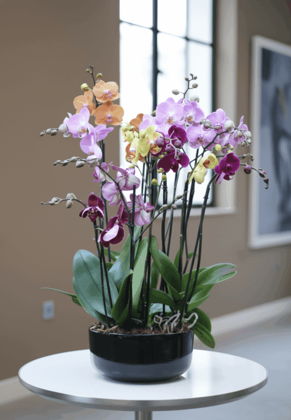 - Diseño en cerámica negra con 6 plantas de orquídeas = 12 a 14 varas florales